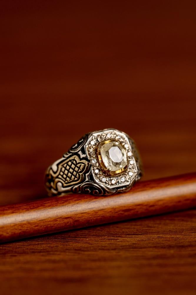 خاتم زفير أصفر طبيعي أصلي بتصميم راقٍ من صياغة حجت، يجمع بين جمال الحجر الأحمر وفخامة الحرفية اليدوية لقطع فريدة من نوعها.